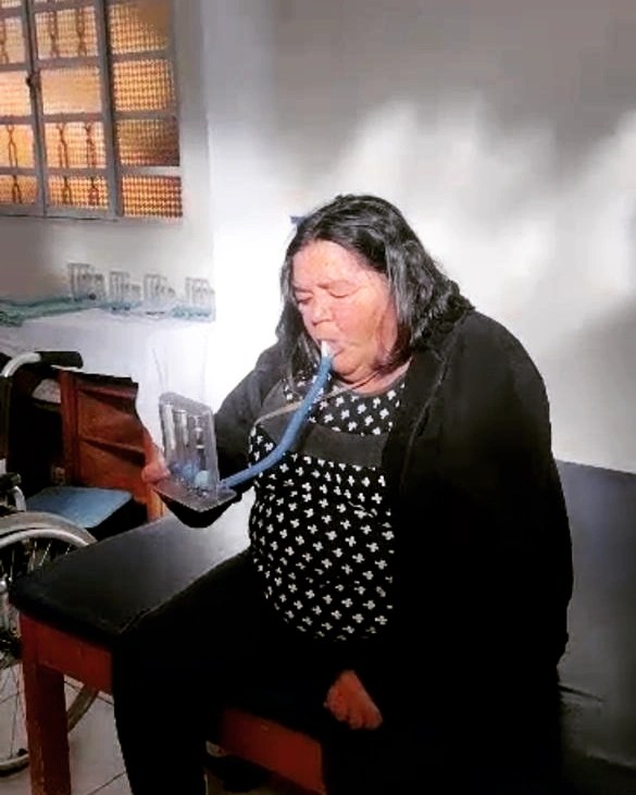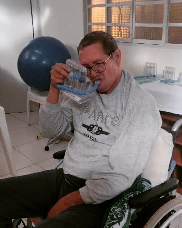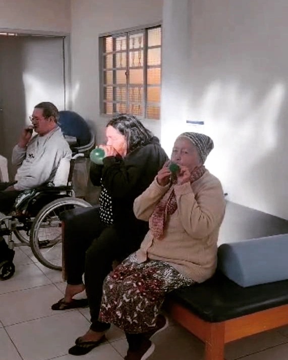 Para essa atividade usamos o Respiron e a bexiga que ajudam no fortalecimento pulmonar e na melhora da respiração.